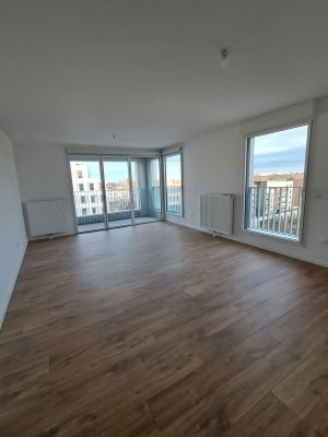 Loue type 3 lumineux dans résidence neuve superficie 72 m² avec pièce de vie spacieuse, 2 chambres, salle de bain avec douche, WC séparé, cellier, balcon et emplacement parking.