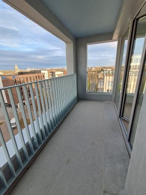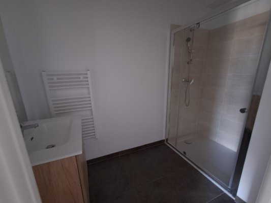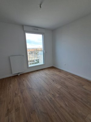 Loue type 3 lumineux dans résidence neuve superficie 72 m² avec pièce de vie spacieuse, 2 chambres, salle de bain avec douche, WC séparé, cellier, balcon et emplacement parking.